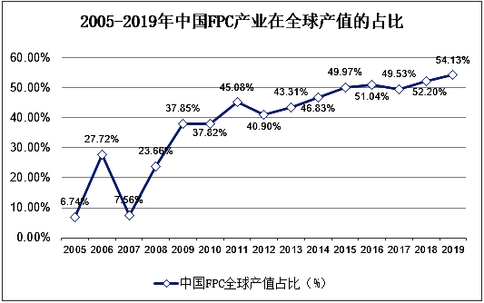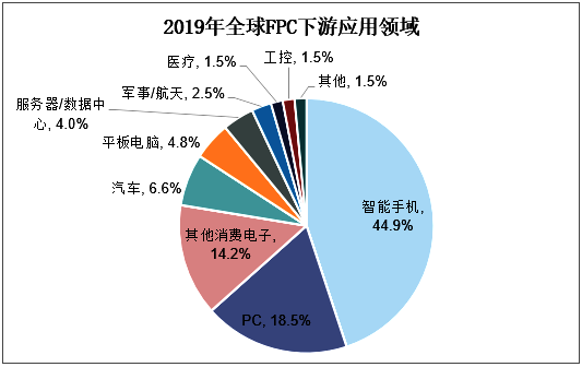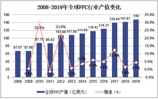 FPC是一種以撓性覆銅板為基材制成的一種具有高度可靠性、絕佳可撓性的印刷電路板。FPC具有重量輕,厚度薄,散熱快等其他種類電路板無可比擬的優(yōu)勢,被廣泛應(yīng)用于PC、消費級電子產(chǎn)品、服務(wù)器/數(shù)據(jù)存儲設(shè)備等電子設(shè)備當(dāng)中。主要通過顯示模組、觸控模組、指紋識別模組等進(jìn)入智能手機(jī)、平板電腦等終端消費品市場。根據(jù)全球FPC行業(yè)產(chǎn)值發(fā)展的里程來看,通信技術(shù)的更新將對FPC行業(yè)產(chǎn)值起到極大的推動作用。據(jù)測算2019年全球FPC行業(yè)產(chǎn)值達(dá)到148億元,同比增長4.5%,未來隨著智聯(lián)網(wǎng)和5G技術(shù)的應(yīng)用推廣,F(xiàn)PC行業(yè)將會面臨更大的市場需求空間.