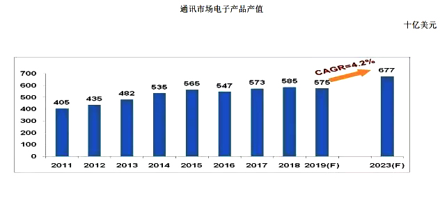 PCB下游的通訊電子市場(chǎng)主要包括手機(jī)、基站、路由器和交換機(jī)等產(chǎn)品類(lèi)別。5G的發(fā)展推動(dòng)通訊電子產(chǎn)業(yè)快速發(fā)展,據(jù)Prismark預(yù)估,PCB下游通訊電子市場(chǎng)電子產(chǎn)品產(chǎn)值在2019年達(dá)到5,750億美元,2019年至2023年將以4.2%的年復(fù)合增長(zhǎng)率增長(zhǎng),成為增長(zhǎng)最快的PCB 產(chǎn)品下游領(lǐng)域。