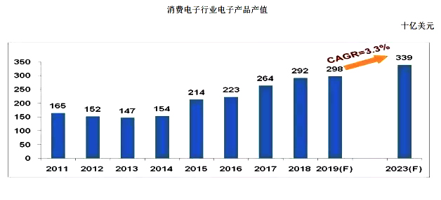 據(jù)Prismark預(yù)估,2019年P(guān)CB下游消費(fèi)電子行業(yè)電子產(chǎn)品產(chǎn)值達(dá)到2,980億美元,預(yù)計(jì)2019年-2023年消費(fèi)電子行業(yè)復(fù)合增長(zhǎng)率為3.3%。