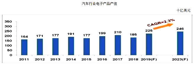 隨著全球汽車(chē)產(chǎn)業(yè)從電子化進(jìn)入自動(dòng)化時(shí)代,帶動(dòng)車(chē)用電路板產(chǎn)值持續(xù)向上攀升,許多電路板業(yè)者爭(zhēng)相投入技術(shù)搶食市場(chǎng)。雖因涉及人身安全導(dǎo)致產(chǎn)品認(rèn)證時(shí)間長(zhǎng)、進(jìn)入門(mén)坎高,但一旦通過(guò)認(rèn)證出貨,將帶給公司穩(wěn)定營(yíng)收增長(zhǎng)動(dòng)能。據(jù)Prismark統(tǒng)計(jì),2019年全球車(chē)用電子產(chǎn)品產(chǎn)值預(yù)估達(dá)到2,250億美元,預(yù)計(jì)2019年至2023年將以2.3%的年復(fù)合增長(zhǎng)率增長(zhǎng)。